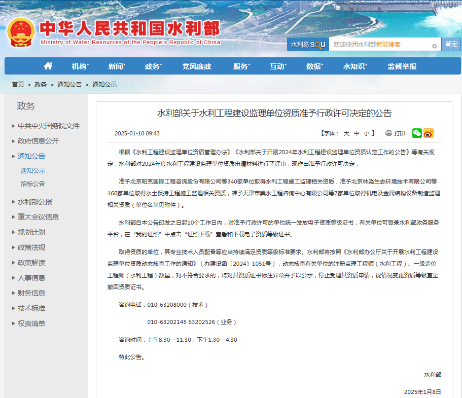 二〇二五年一月,經(jīng)水利部批準(zhǔn),我公司同時(shí)取得水利工程施工監(jiān)理乙級(jí)資質(zhì)及水土保持工程施工監(jiān)理乙級(jí)資質(zhì)。這是我公司在取得工程監(jiān)理綜合資質(zhì)后,又獲得的住建部管理范疇之外的從業(yè)資格,為公司經(jīng)營(yíng)業(yè)務(wù)開(kāi)辟新的領(lǐng)域,為公司業(yè)務(wù)類(lèi)型的拓展提供新的平臺(tái),也為公司持續(xù)、快速發(fā)展奠定了堅(jiān)實(shí)基礎(chǔ)。